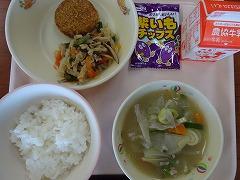 ↓今日の給食です。イカメンチカツ、切り干し大根の炒め煮、豚汁とサツマイモチップスです。あったまるメニューでした。明日から雨が続くようです。気温も下がりそうですので、あたたかくして登校してください。