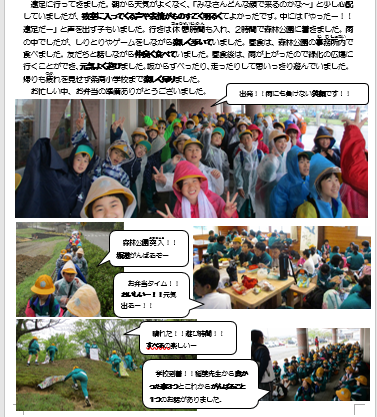 今日は全クラス紹介できませんでしたが、1週間かけて、紹介していきますので、保護者の皆様、これからも、HPちょこっと参観してくださいね。今週は雨が多い天気予報です。傘に当たる雨の音を楽しみながら登校してください。車にはくれぐれも気を付けて登下校してください。