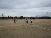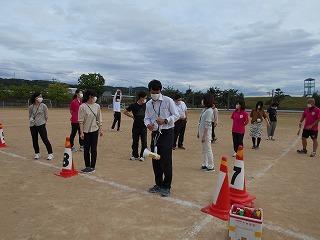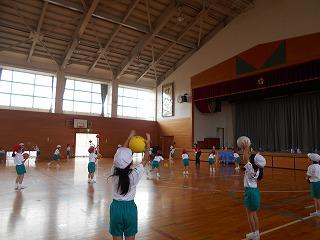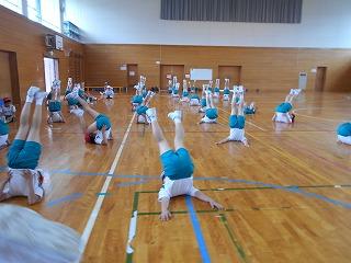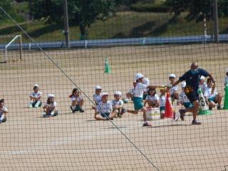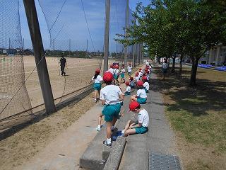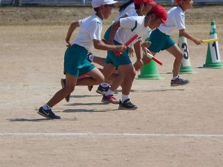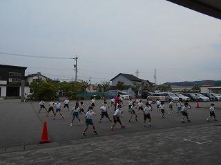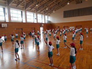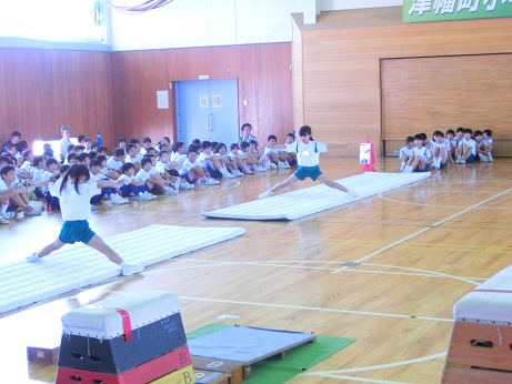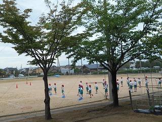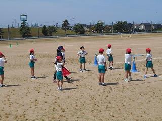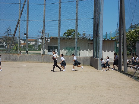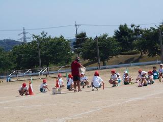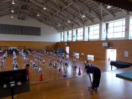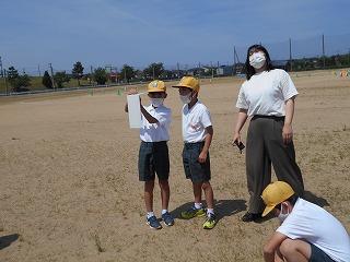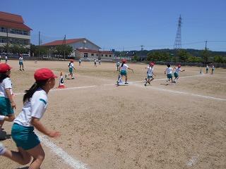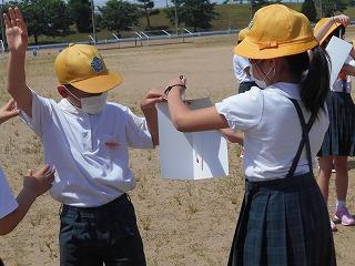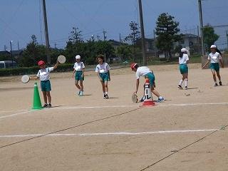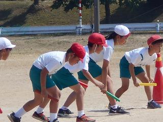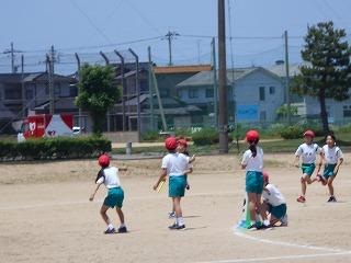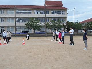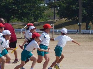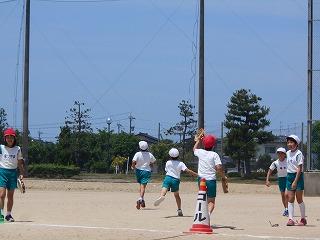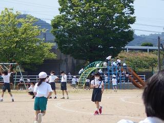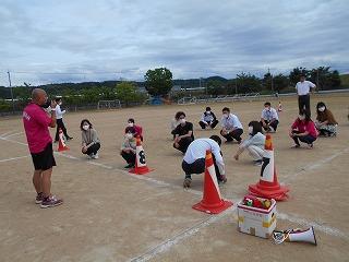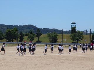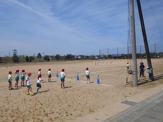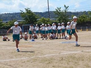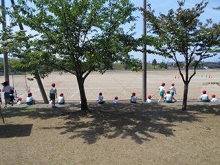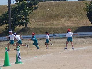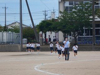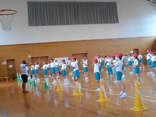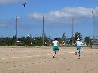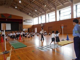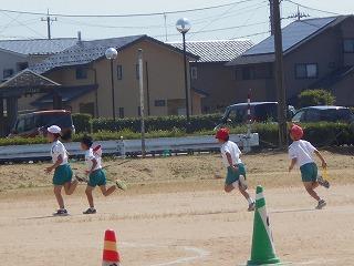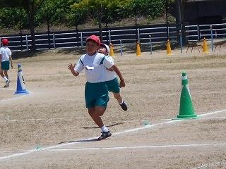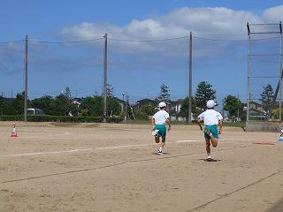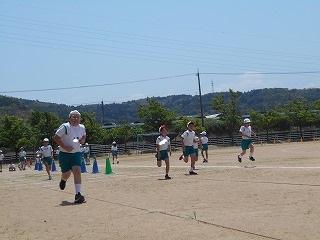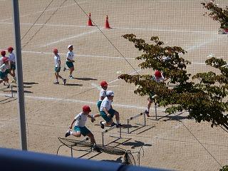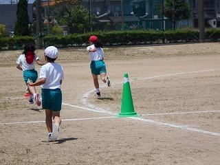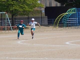 ↑ 4年体育 50m走ですが、ゴールのタンバリンを早く叩いた方が勝ちというゲームです。ゴールまで全速力で走り切っていました。
