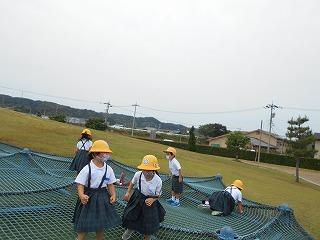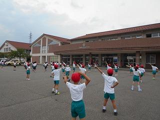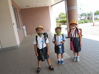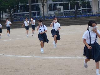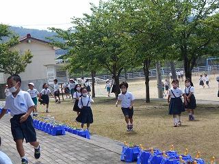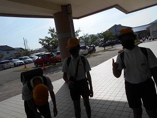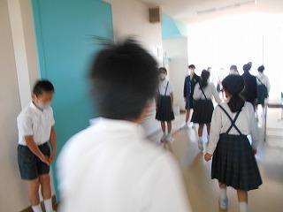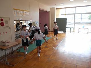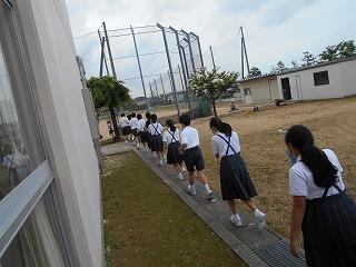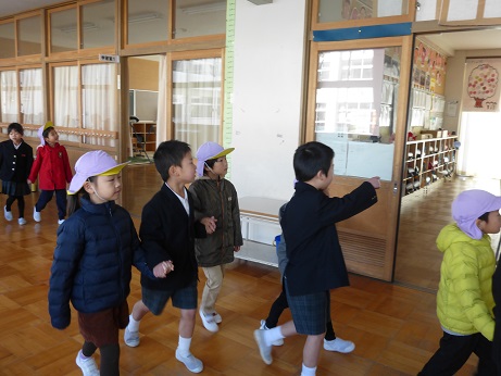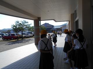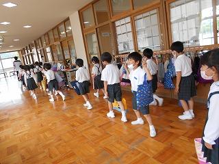 ↑ 3年生の避難訓練です。ハンカチを口と鼻に当て、すばやく避難できました。絶対に火事を起こさないように火の用心を心がけましょう。
