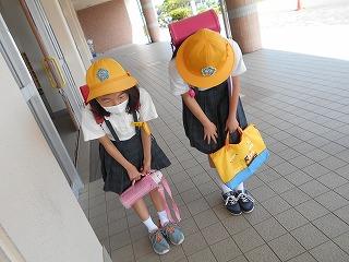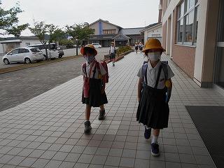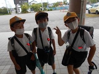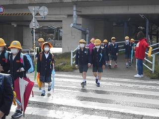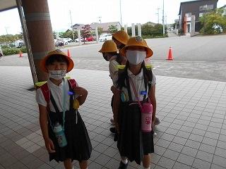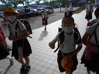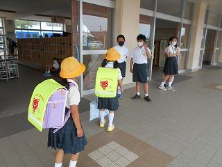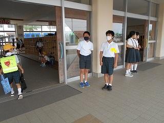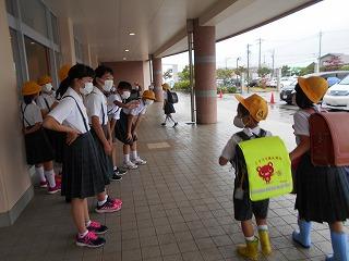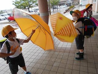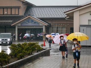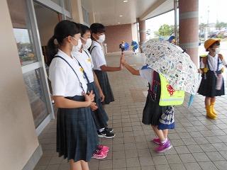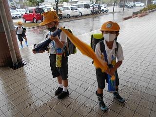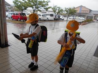 ↑ 今朝はものすごい「どしゃぶり」でした。1年生は入学以来の初めての大雨の中の登校ですが、カッパや傘をさして、元気よく登校してきました。外は雨ですが、6年生とさわやかなあいさつを交わすことができました。