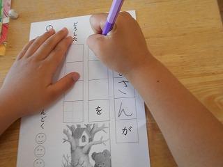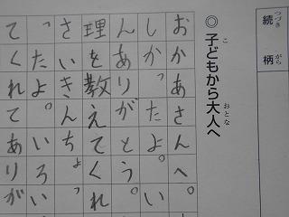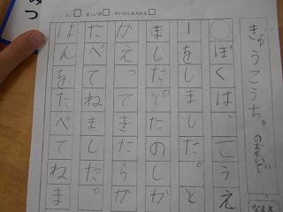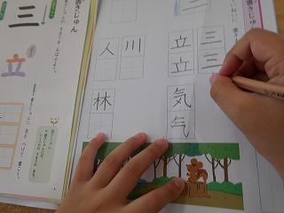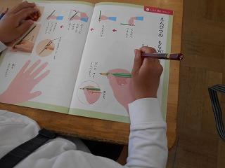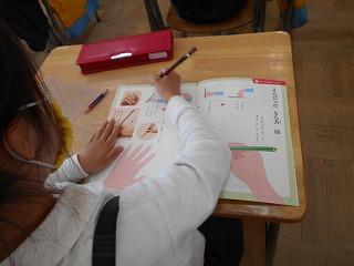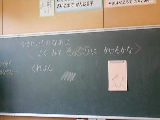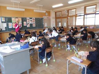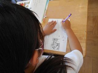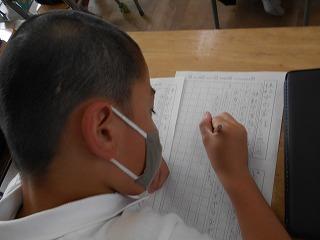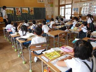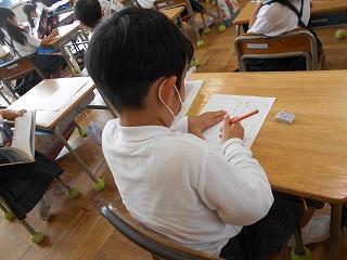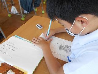 ↑ 2年3組 書写の先生と、筆順に気を付けて正しく書く練習です。正しい筆順で書くと、なんと、美しい文字になります。正しい姿勢と正しい鉛筆の持ち方と、正しい筆順で、美しい文字を書く学習をしました。