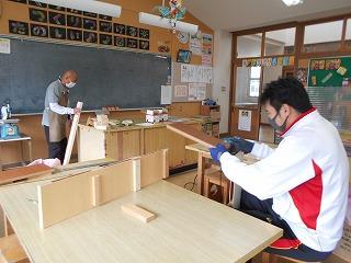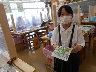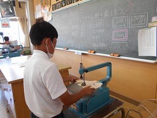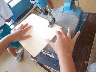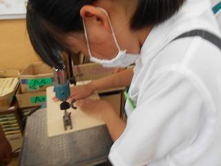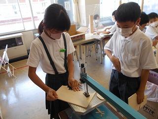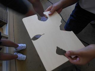 ↑ 5年2組 図工 糸鋸ミシンでパズルづくりです。丁寧に木を動かし、曲線もきれいに切り取ることができました。