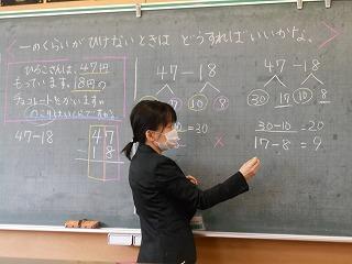 ↑2の1 算数 ひきざんのひっ算のしかたの活用問題です。まず、お話問題に線を引いて、意味を理解しました。そして、生活の中の算数を考えました。聴き方が素敵なので、安心して話すことができます。