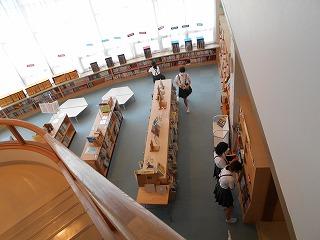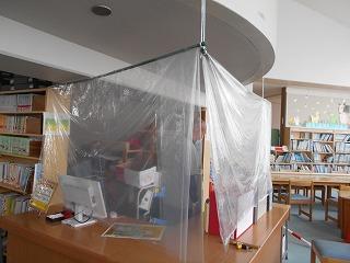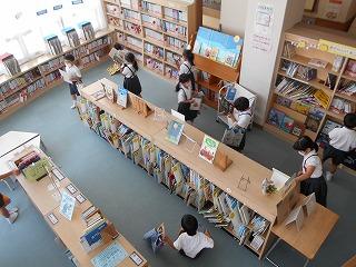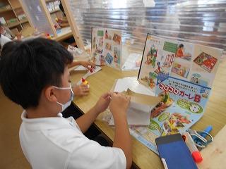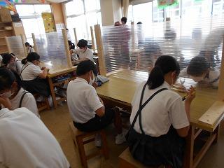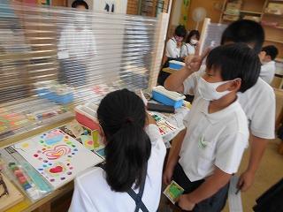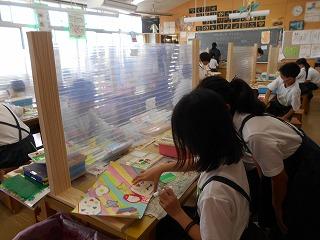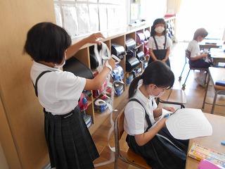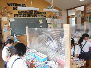 ↑ 朝休み、図書館で本の貸し出しをしています。密にならないように、学年の割り当てがされています。