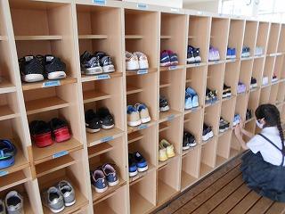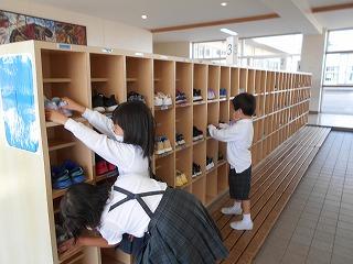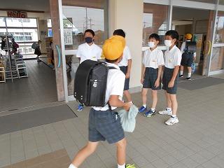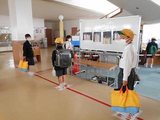 ↑6年生が玄関で、あいさつをしてさわやかに下級生を迎えてくれます。心と心を通わせるあいさつは、すてきですね。