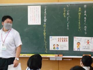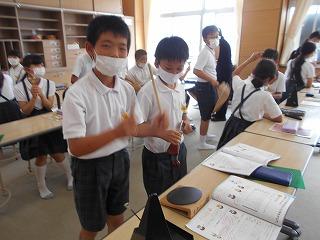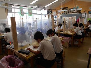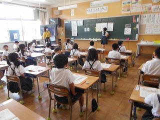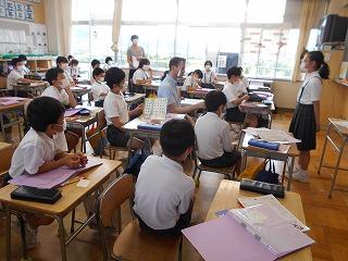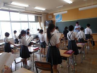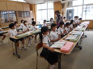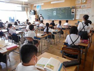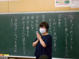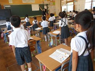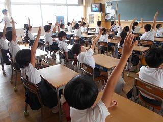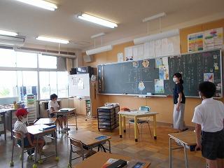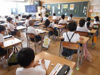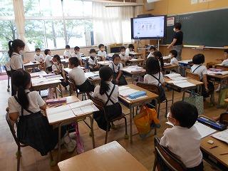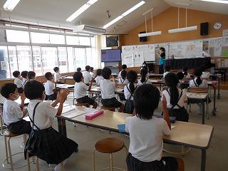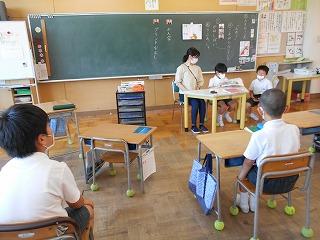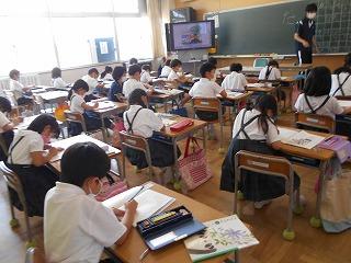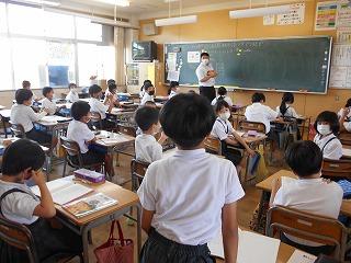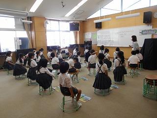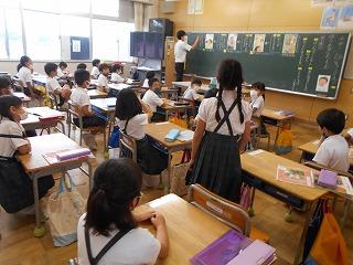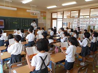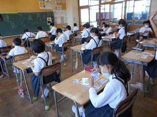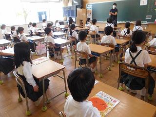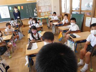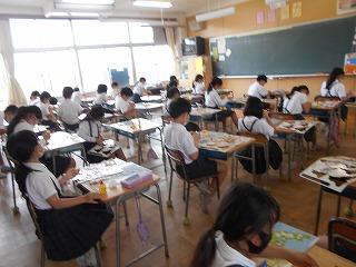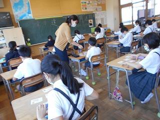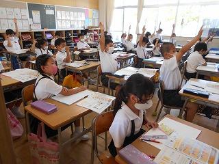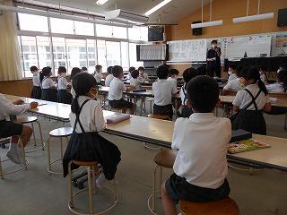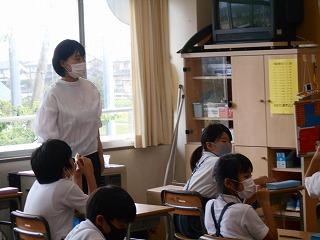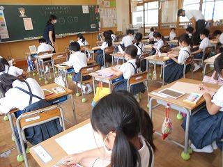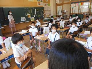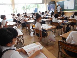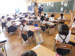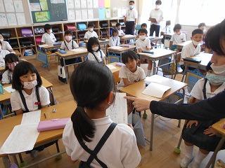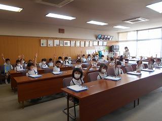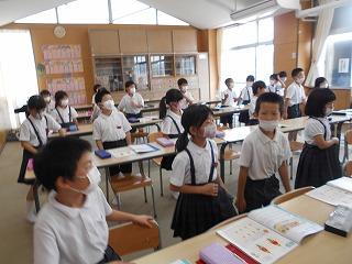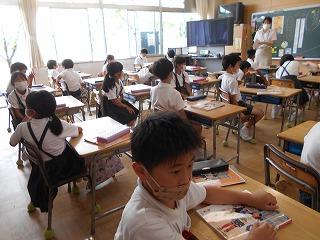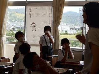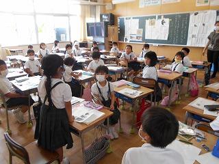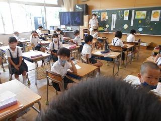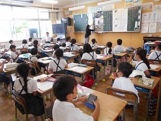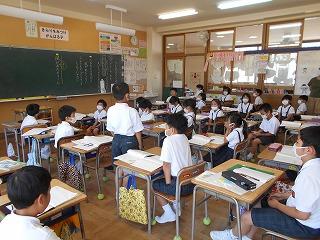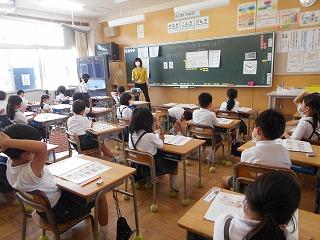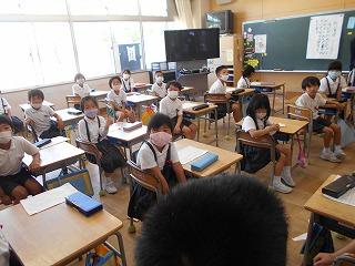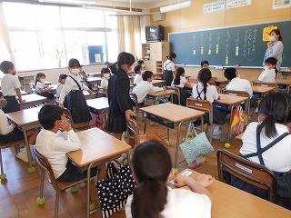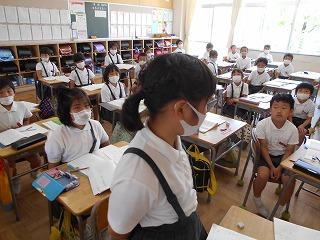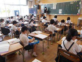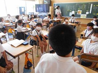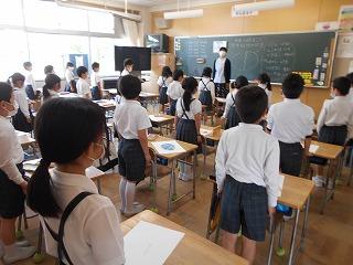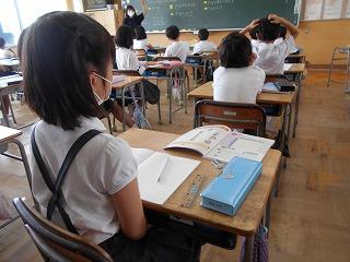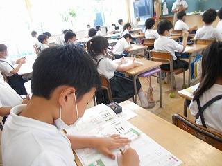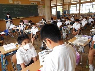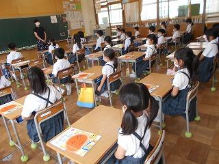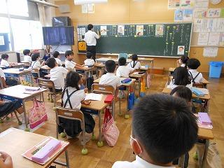 ↑生活担当の先生から6月の生活目標のお話です。「ありがとう」を見つけて、感謝の気持ちをたくさん伝えてください。教室では、先生の呼びかけにしっかりと反応していました。4年生は、国語の学習と関連して、聞き逃さないようにメモを取りながら話を聴いていました。
