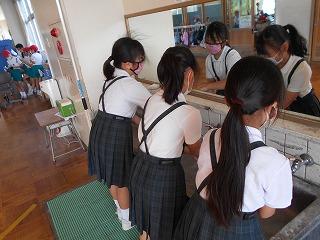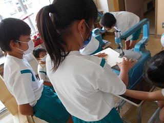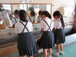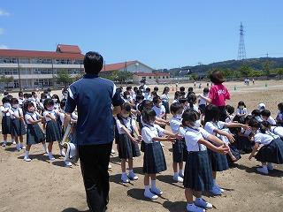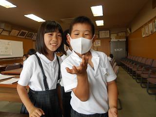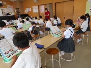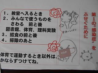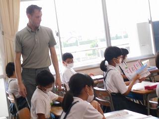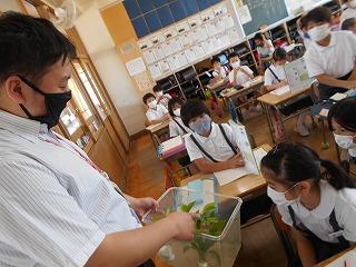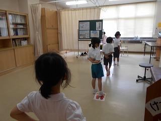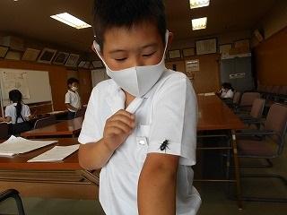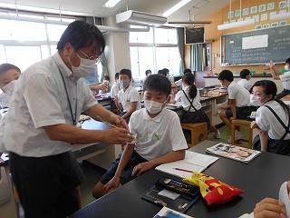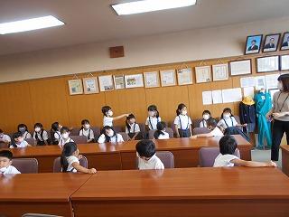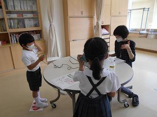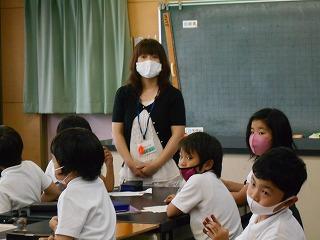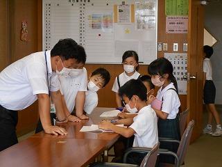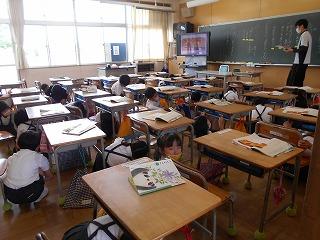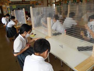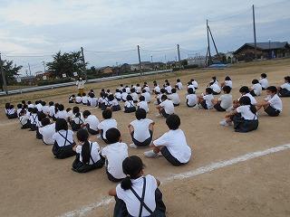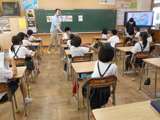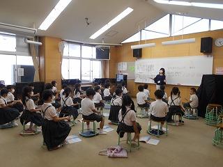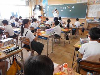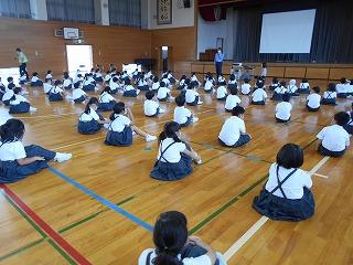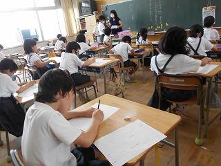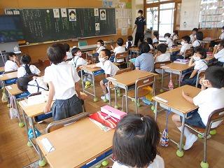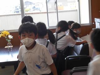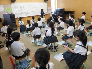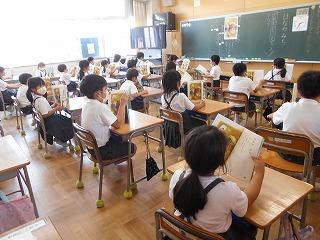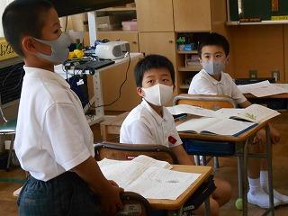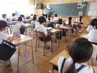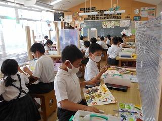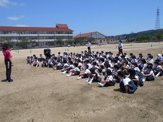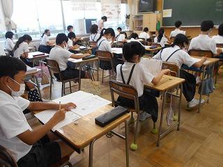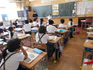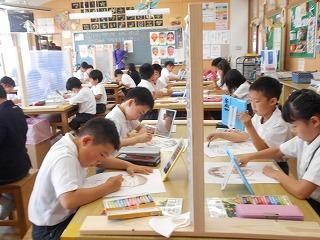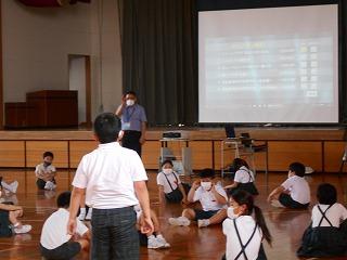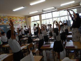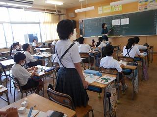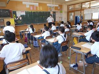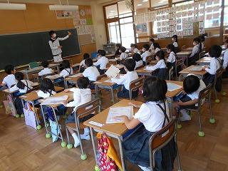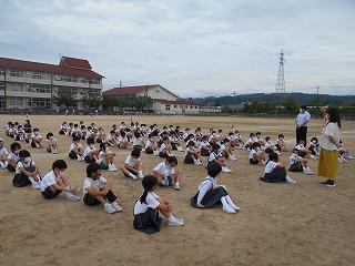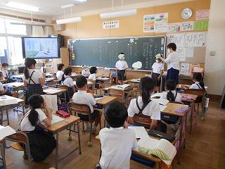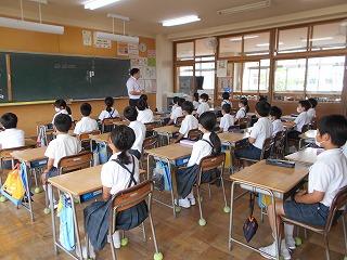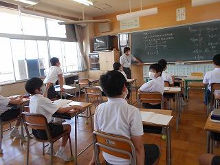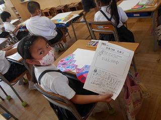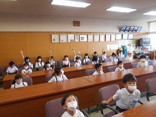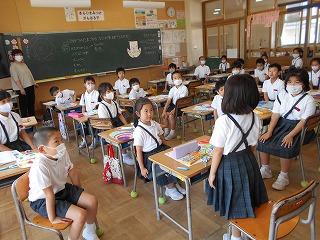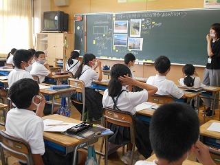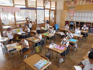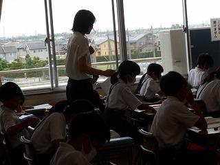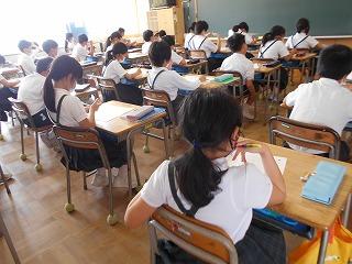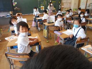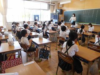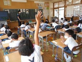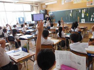 ↑生活担当の先生から6月の生活目標のお話です。「ありがとう」を見つけて、感謝の気持ちをたくさん伝えてください。教室では、先生の呼びかけにしっかりと反応していました。4年生は、国語の学習と関連して、聞き逃さないようにメモを取りながら話を聴いていました。