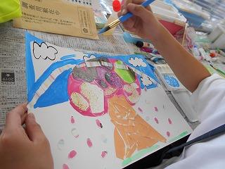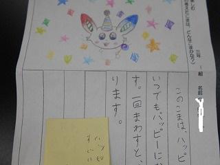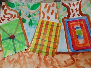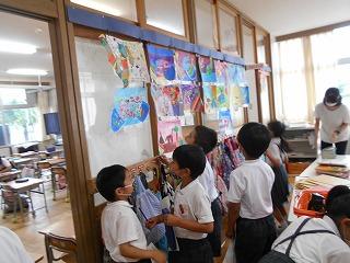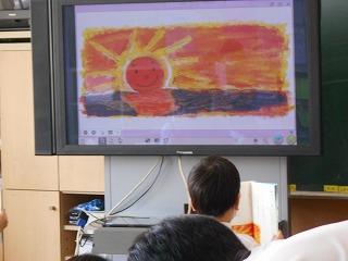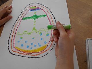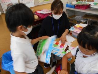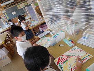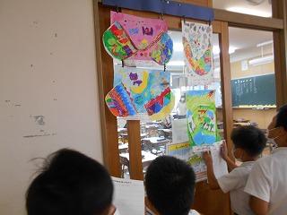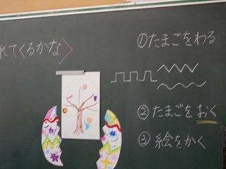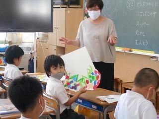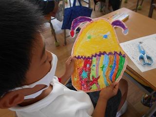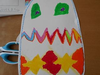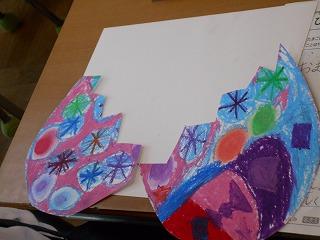 ↑2年3組図画工作 友達のびっくり卵を鑑賞しました。工夫したところや色づかいなど素敵なところを見つけ、カードに書きました。発想がどれも素敵です。