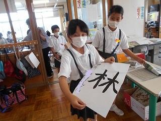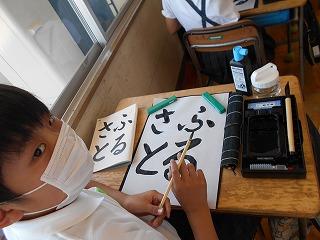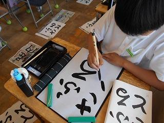↓ 4年2組さんの習字を見せてもらいました。お手本をよく見て、頑張って書いていました。力強くバランスの整った字です。