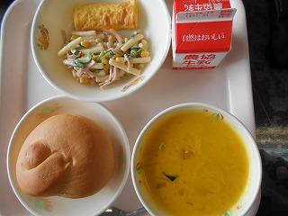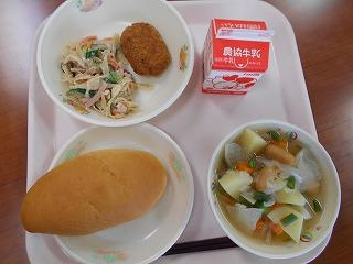 ↑ 今日の給食もすごいですよ。チーズたっぷりのパン、チーズクッペと豚肉たっぷりのサクサクコロッケに、野菜やウインナーがたっぷり入った野菜のスープ煮と、食物繊維たっぷりのごぼうサラダです。ごまドレッシングが香ばしく、ハムも入っていて子供にも食べやすく工夫されています。毎日給食が楽しみです。