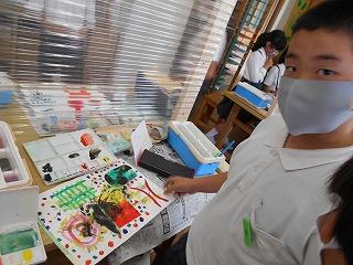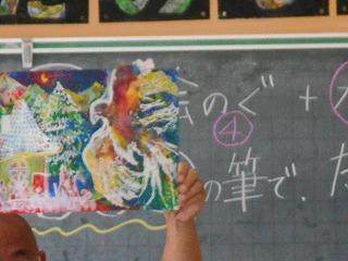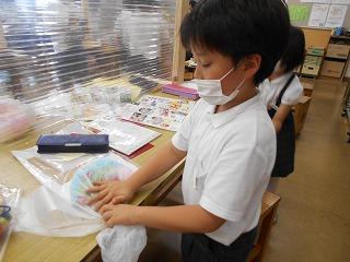 ↑3の1図画工作 級外の先生と図工学習をしています。ふくろにいろいろ詰め込んで、「ふわふわするもの」何が出来上がるかな?