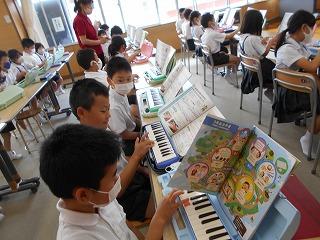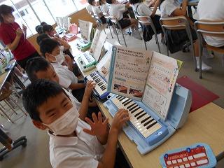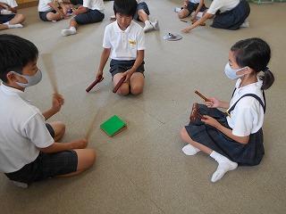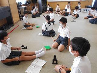 ↑ 6年2組 音楽専科の先生と音楽の授業です。まだ本格的に歌を歌ったり、リコーダーを演奏したりする学習は控えています。そこで、打楽器アンサンブルを素敵に演奏するための練習をしています。チームのアイコンタクトでの8小節のリズムアンサンブル、演奏が楽しみです。