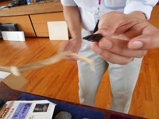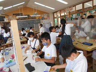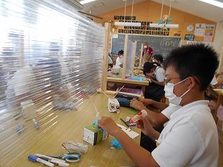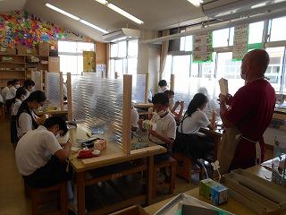 ↓6年2組 図画工作 級外の先生と学んでいます。体育が専門ですが、図画工作も得意中の得意、アイディアがいっぱいの先生です。針金をクランクに曲げて、それを生かして、動く置物を作成中です。巧みな技能と豊かなアイディアが磨かれます。