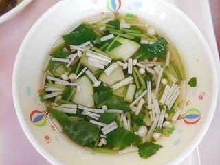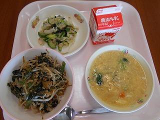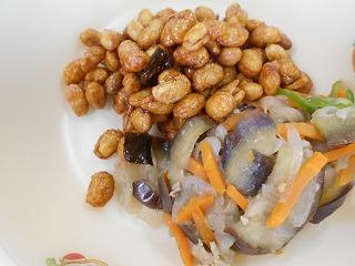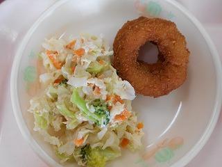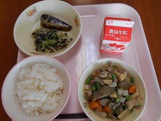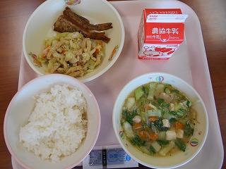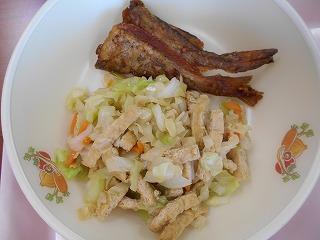 ↑はたはたのから揚げ、油揚げとキャベツの和え物、とり野菜です。はたはたは骨まで柔らかく、カルシウム満点です。薄あげと旬のキャベツがおいしくマッチした和え物です。そして、とり野菜にも旬の野菜がたっぷりで、うれしい限りです。