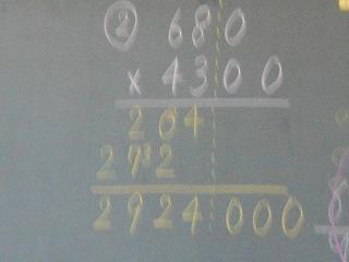 ↑ 4年算数 かけ算のひっ算を工夫しました。簡単にできるようになりました。これも繰り返しで力が付きます。「根気よく」に挑戦ですね。