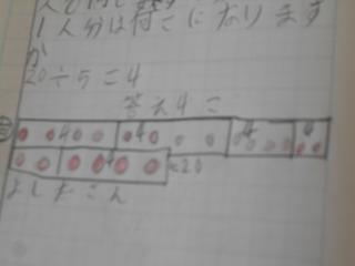 ↑3の3算数 わり算のお話問題に挑戦しています。式と図をノートに書いて、「分ける」意味を理解していました。