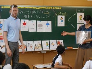 ↑4の1 外国語活動 ジョナサン先生と英語専科の先生で、外国語に慣れ親しむ学習をしています。今日は遊びに誘われた時返事の仕方について学習しました。Let's play  cards.