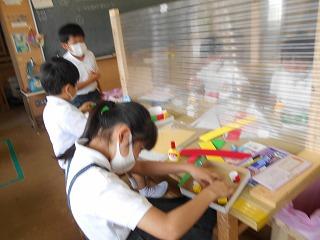 ↑4年2組図画工作 コロコロコロガーレ、ビー玉がどのような動きをするか、考え4段タワーを作っています。出来上がりが楽しみです。