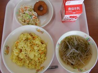 ↑ 今日の給食は、カレーピラフにサクサクのイカリングフライ、キャベツのレモンサラダにもずくスープです。蒸し暑くても、食欲がもりもりわくメニューです。とても食べやすく、さわやかで、おいしい味付けです。