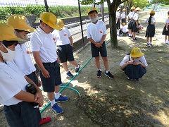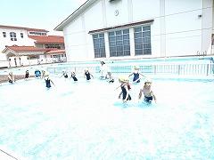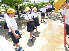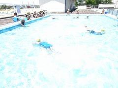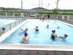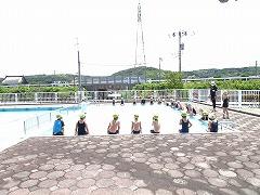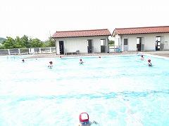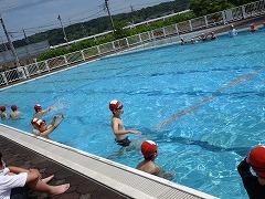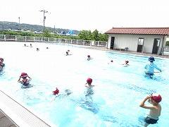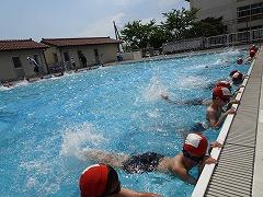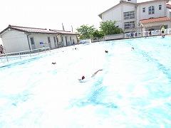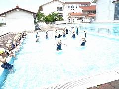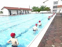 ↓1年生が、小学校のプールに初めて入りました。小学校には、浅いプールも有りますので、1年生も安心して入ることができます。AグループとBグループに分かれて、交替でプールに入っています。