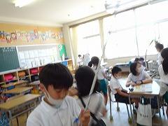 ↑6の1理科 ホウセンカの水の通り道を観察しました。赤い液で染めたホウセンカの茎や根を縦や横に薄く切り、顕微鏡で観察しました。
