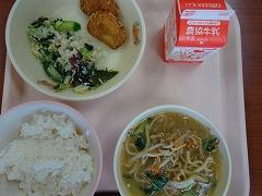 ↑今日の給食です。担々麺、納豆のナゲット、中華和えでした。担々麺には、豚肉にみそ、にんにく、しょうが、玉ねぎ、ねぎもやしが入って、深みとコクのある豊かな味わいでした。豆腐ナゲットは、ヘルシーでさわやかな味でサクッと揚がり、とてもおいしくいただきました。中華和えは、鶏肉とわかめがたっぷりで、子供たちもおいしくいただける組み合わせでした。