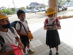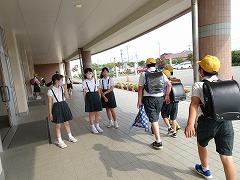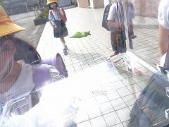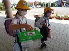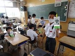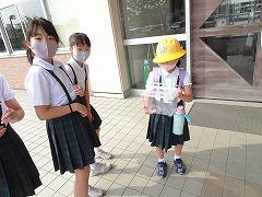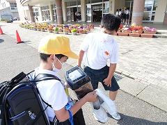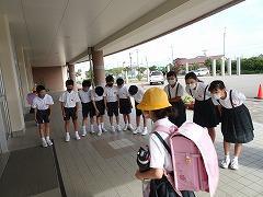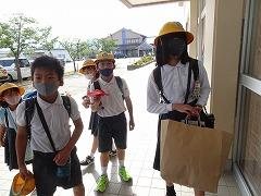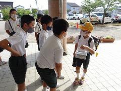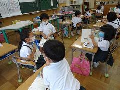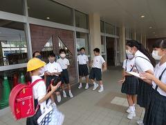 ↑目を合わせて下級生にあいさつをしている高学年、素敵な心があいさつにあらわれていますね。ショウリョウバッタの幼虫のようです。袋の中は教室に飾り付ける手作りかざりだそうです。楽しい会があるのかな。