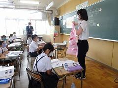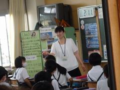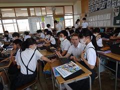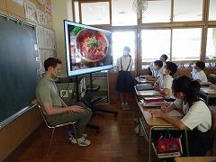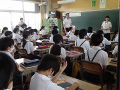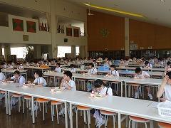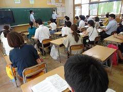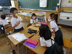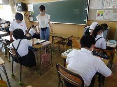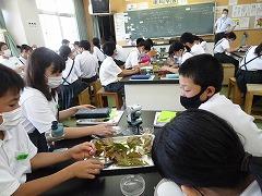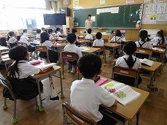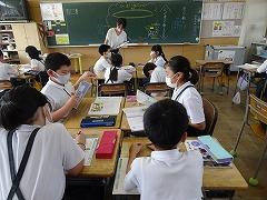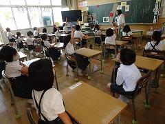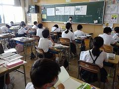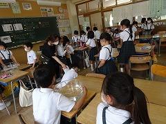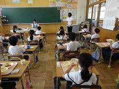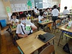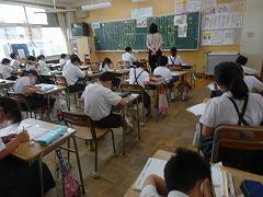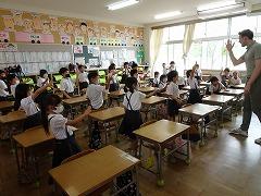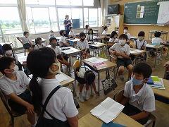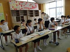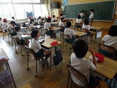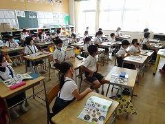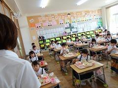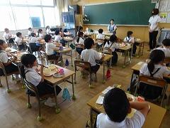 ↑給食の時に、献立を考えてくださっている栄養の先生に来ていただきました。今日のメニューは中国料理で、スープの「きゅうりのサンラータン」には、酢が入っているそうです。酢は食欲増進作用があり、夏バテ防止に効果があると教えていただきました。ピリ辛チキンも食欲増進、キャベツの塩昆布和えの塩分は熱中症防止となります。今日は蒸し暑い梅雨の時期も元気に過ごすためのメニューでした。いろいろ考えてくださり、ありがとうございます。