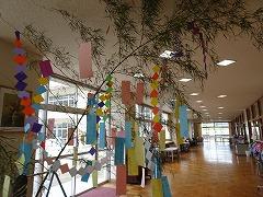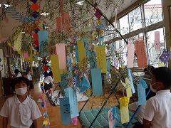 PTAの方からいただいた立派な笹です。ありがとうございます。1年生が願い事を書き、飾りも作りました。