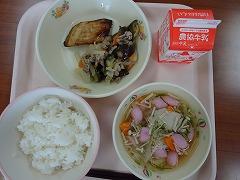 ↓今日の給食です。さばのみりん漬け、なすのみそいため、すまし汁でした。なすのおいしい季節になってきました。みそ炒めにもチャレンジしてみようと思いました。豚肉と、ピーマン、にんじん、玉ねぎも一緒に炒めてありました。体の調子を整える夏野菜です。いろいろアレンジして料理し、たっぷりといただきました。
