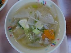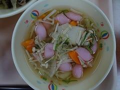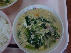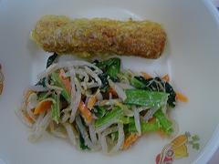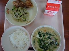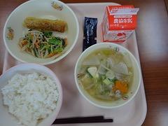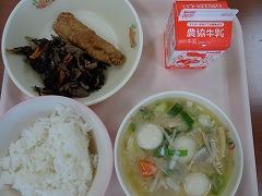 ↑今日の給食は和食です。小松菜の胡麻和え、みそけんちん汁、ちくわの磯部揚げにのりの佃煮でした。けんちん汁には鶏肉、木綿豆腐に大根、人参、たまねぎ、ごぼう、こんにゃく、ねぎとたくさんの食材をいただくことができました。胡麻和えでは、もやしに小松菜、人参と、野菜をごま風味でおいしくいただくことができました。