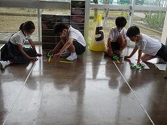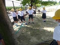 ↓5の3 理科 流れる水の働きの学習です。川はどのようにしてできるのか、ホースで斜面に水を流し、川のできるまでの様子を観察しました。