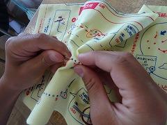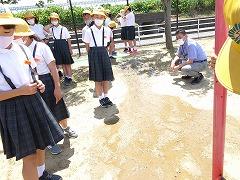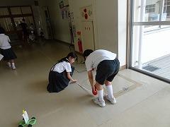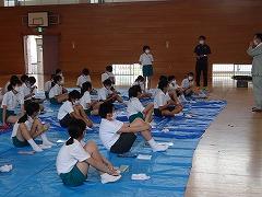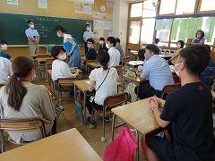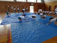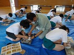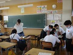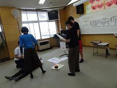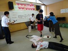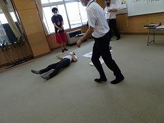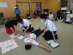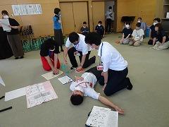 ↑速やかな指示伝達により、救急搬送まで間、適切に心肺蘇生を行う訓練です。養護教諭が講師となり、みんなで再確認しました。