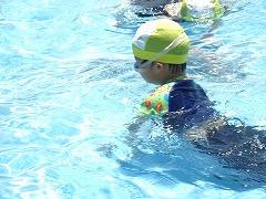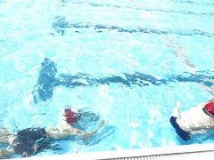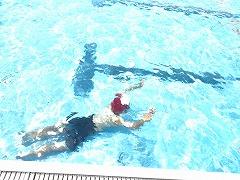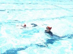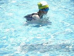 ↑1の2 プール学習です。水と仲良くなるのが目的です。もぐって、石拾いをしました。顔を付けると、きれいな水の中の世界が見えますね。