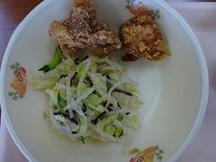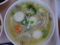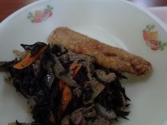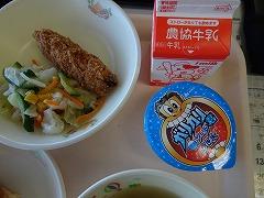 ↓今日の給食です。魚のから揚げ、何かな?いわしやアジとは違うさっぱりしたから揚げでした。これは・・・、トビウオでした。夏の季節感をたっぷりのメニューです。ひじきのきんぴらとごま汁、お餅も入っておいしかったです。