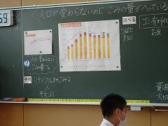 ↑4の1社会科 〈ごみを減らすために津幡町ではどのような取組をしているのかな〉津幡町の人口の変化とゴミの量の変化を見比べ、課題意識を高めています。人口は変化がないのに、燃えるごみの量が減ってきています。どうしてかな。社会科では、複数資料を見比べて考える力が求められています。