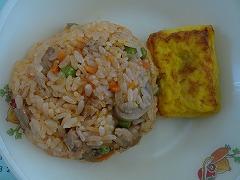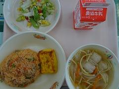 ↑今日の給食です。今日の給食は、チキンライス、ハムチーズピカタ、カラフルサラダ、エビボールとパスタのスープでした。おしゃれなイタリアンでした。
