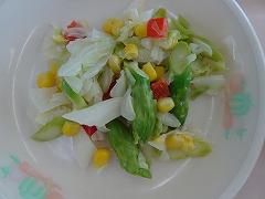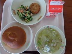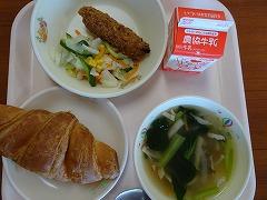 ↑今日の給食は、クロワッサン、カレーロール、キャベツのマリネ、マカオロニスープ、そしてデザートにアイスです。夏バテ防止のビタミンたっぷりのメニューです。