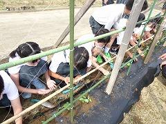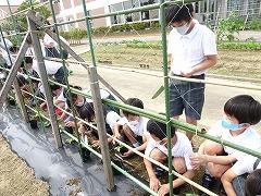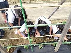 ↓4年生 ヘチマの苗の植え替えをしました。根っこが、こんなに伸びていました!優しく植えました。立派なヘチマの棚は、校務員さんの手作りです。ありがとうございます。