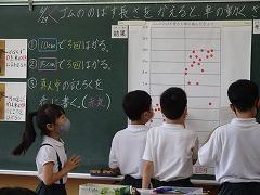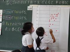 ↑3の2 理科 ゴムで動かそう ゴムをのばした長さによって、動く距離に違いはあるのだろうか、ゴムの伸びを10cm、15cmとして、車が動く距離を測定する実験を行いました。