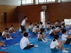 ↑プール学習 5年生 感染対策を十分とって、泳ぎの練習をしました。水が気持ちよさそうです。プールサイドにプールの水を撒いて、消毒しています。自分の目標を立て、プール学習を楽しんでいます。