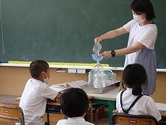 ↑2の3 算数 水のかさの学習です。5デシリットルで1Lのペットボトルの半分、水が入りました。