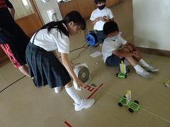↓3の1理科 風で動く車に挑戦です。風を送って、どうしたら速く動くのか、考えました。