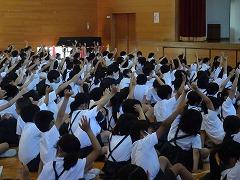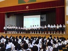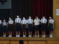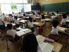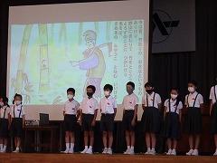 ↓7月の学校集会を行いました。「竹取物語を暗唱してみませんか」と呼び掛けたところ、たくさんの5年生、6年生が合格しました。また、2年、3年生にもチャレンジして覚えた人がいました。そこで、その代表の人たちに暗唱を披露してもらいました。すらすらで、はっきりと、声をそろえて暗唱ができ、古典の世界が体育館いっぱいに広がりました。今覚えたフレーズは、きっと中学生や高校生になっても、すぐに思い出すことができると思いますよ。