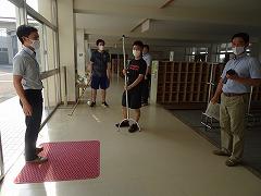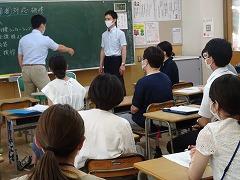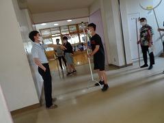↓業後は、「不審者侵入時の対応訓練」を教職員で実施しました。警察の方をお招きし、お一人は実際に不審者役になっていただき、もうお一方は、私たち教職員の対応を観察して、指導助言をいただきました。