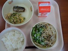 ↑今日の給食は「ひんやり!ひやむぎ」でした!きゅうりと干しシイタケとねぎのトッピングでつゆもおいしくいただきました。また、ゴーヤチャンプルとさんまの生姜煮もありました。夏メニューです。