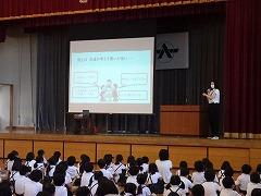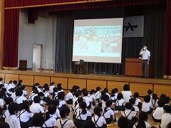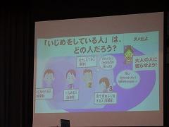↓私からは、「仕事をする時の気持ち」と「いじめの4層構造」についてお話しました。仕事については、自分の当番としての役割を果たしたり、係を楽しく工夫したり、進んでボランティアしたりすると、どれも、役に立ってうれしい気持ちになり、周りからも信頼され、最後に「自分に自信がついてくる」というお話をしました。いじめの4層構造については、明らかにいじめをしていない人は、「ダメだよ」と言ったり、大人の人に知らせたりする人のことです。周りで笑っている人も、止めずにただ見ているだけ人も、いじめに加担していることになるのです。