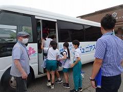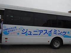津幡町にアザレアがオープンし、町内の3年生が1クラスずつ2回、アザレアでプールの授業を受けることができます。そのトップバッターが条南小3年1組、アザレアのバスが条南小に迎えに来てくれました。かわいいペンギンのキャラクターとアザレアの花が描かれている、素敵なバスに3年1組さんはわくわくしながら乗り込みました。