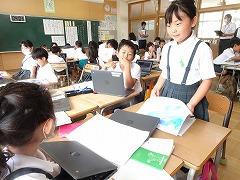 ↓2年 生活科 津幡町の探検をしたことをプレゼンテーションにまとめました。友達のプレゼンテーションを開いて、読んでいます。
